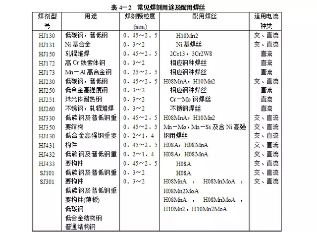 低碳鋼的焊接可選用高錳高硅型焊劑,配合H08MnA焊絲,或選用低錳、無(wú)錳型焊劑配H08MnA、H10Mn2焊絲。低合金高強(qiáng)度鋼的焊接可選用中錳中硅或低錳中硅型焊劑配合與鋼材強(qiáng)度相匹配的焊絲。 耐熱鋼、低溫鋼、耐蝕鋼的焊接可選用中硅或低硅型焊劑配合相應(yīng)的合金鋼焊絲。鐵素體、奧氏體等高合金鋼,一般選用堿度較高的熔煉焊劑或燒結(jié)、陶質(zhì)焊劑,以降低合金元素的燒損及摻加較多的合金元素。不同鋼種焊接用的焊劑與焊絲配用見(jiàn)表。