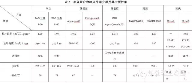 聚合物淬火冷卻介質(zhì)是以聚合物、添加劑和緩沖劑作為溶劑的水溶液。聚合物的冷卻性能可以靠改變濃度方式在很寬范圍內(nèi)調(diào)節(jié)。聚合物的淬火烈度與介質(zhì)濃度、攪拌程度、液溫有關(guān)。表1為聚合物淬火冷卻介質(zhì)分類及使用特點(diǎn)。目前市場(chǎng)上銷售的部分聚合物淬火冷卻介質(zhì)及其主要性能見表2。