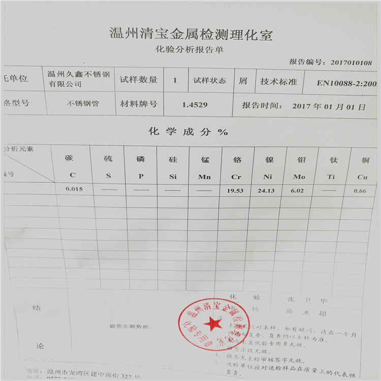 1.4529材質(zhì)不銹鋼無(wú)縫管化驗(yàn)報(bào)告