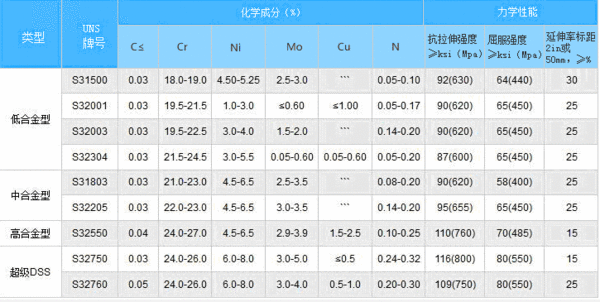 第四類屬超級雙相不銹鋼型,含高鉬和氮,標準牌號UNS S32750(25Cr-7Ni-3.7Mo-0.3N),有的也含鎢和銅,PREN值大于40,可適用于苛刻的介質條件,具有良好的耐蝕與力學綜合性 能,可與超級奧氏體不銹鋼相媲美。