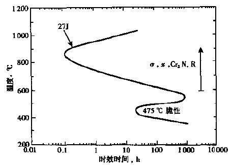 表1列出鋼管和鋼板的室溫力學(xué)性能,表2為鋼板的高溫力學(xué)性能。圖1為相應(yīng)韌性為27J的時(shí)間–溫度–相變曲線。有σ相和475℃兩個(gè)脆性區(qū)。